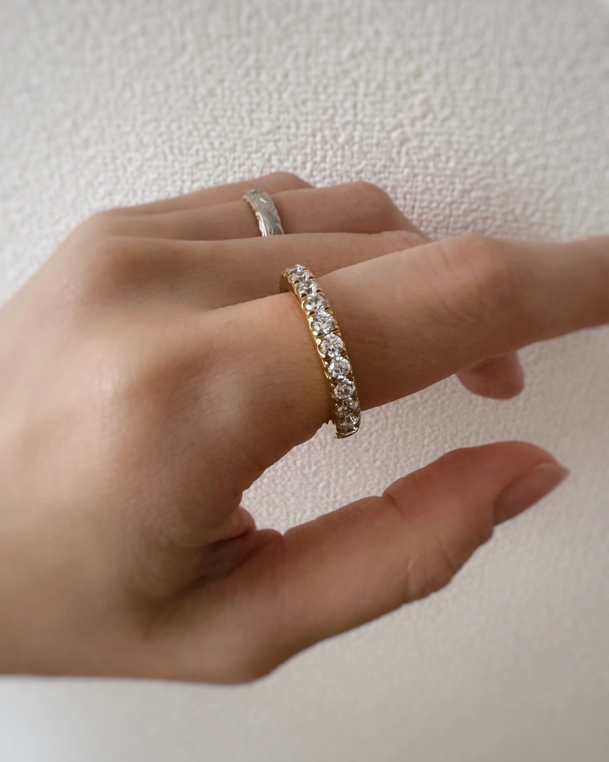 華やかな輝きを放つジルコニアを、リング全体にぐるりと敷き詰めたフルラインデザイン。