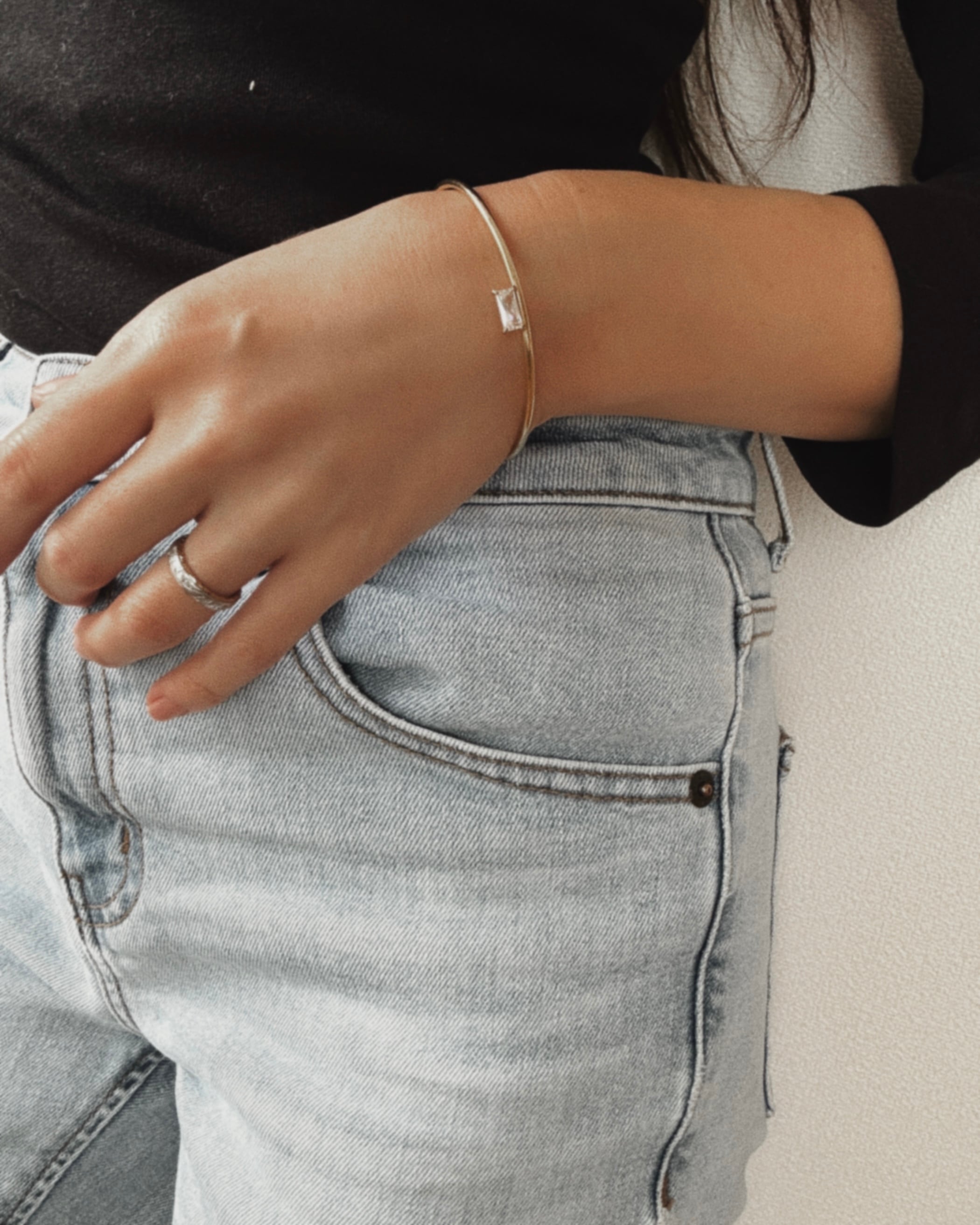 華奢なラインに、スクエアカットのストーンを一粒あしらったミニマルデザインのカフバングル。