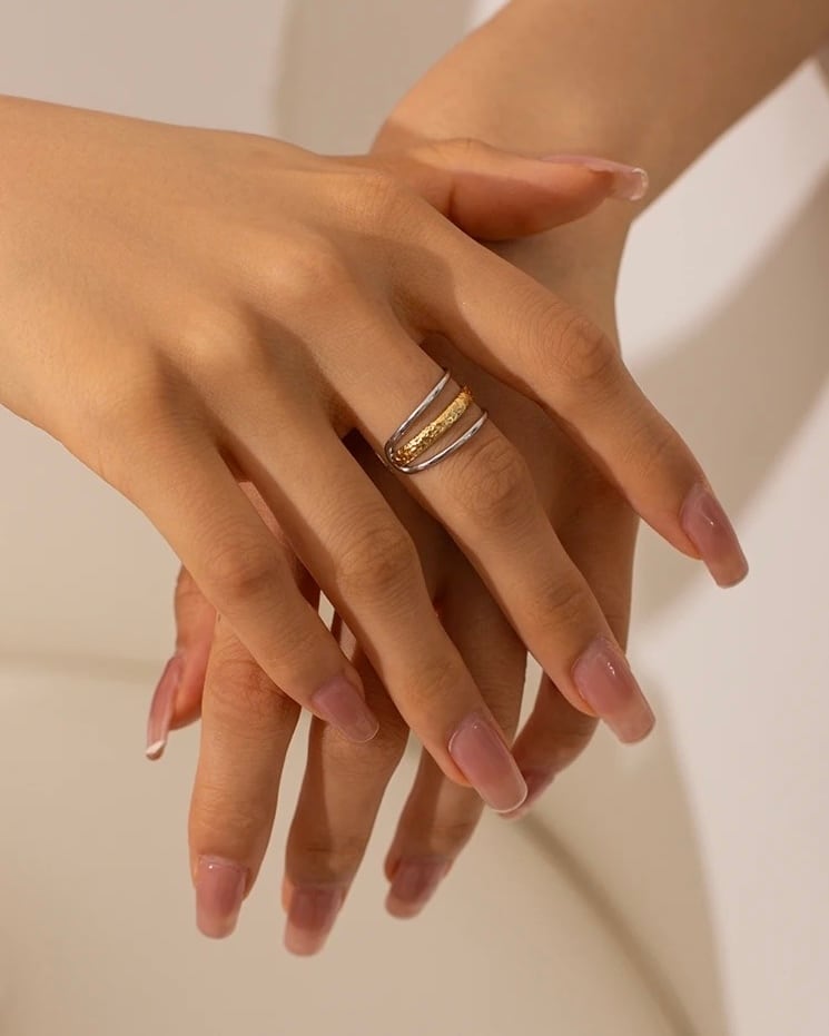 バイカラーがリング全体に独特の華やかさを加え、サイズを気にせずに着けられるフリーサイズ仕様で、幅広い指サイズに適応します。