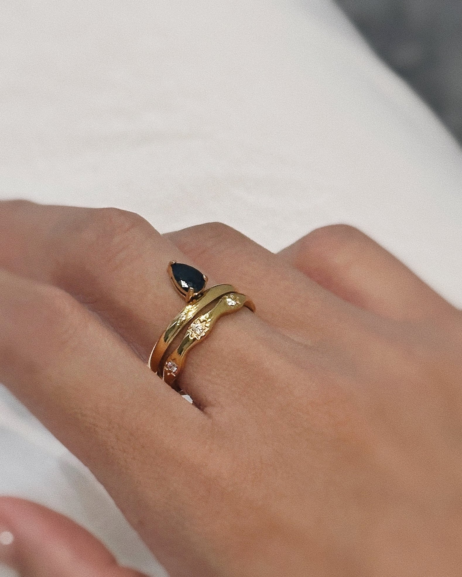 ヘキサグラムの繊細なモチーフがリングを囲む独特のデザイン。ジルコニアがその中心で輝き、洗練されたバランス感を表します。緩やかなシルエットと共にリズミカルな美しさを奏でる、パワーある雰囲気を纏ったアイテム。