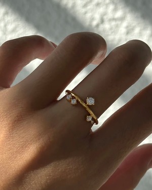 繊細なゴールドのラインに、光を散りばめたように大小のジルコニアが優しく寄り添うリング。