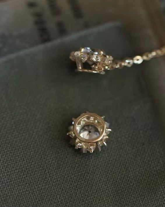 そのトップには、小ぶりながらも凛とした美しさを放つ花のモチーフが、まるで今この瞬間に咲いたかのように佇む——